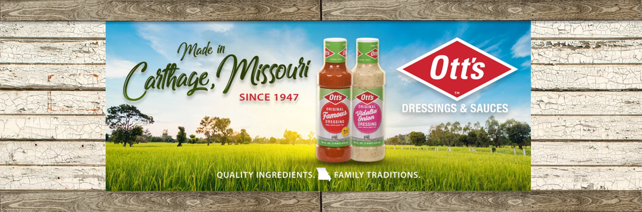 Ott’s knows Dressings, Marinades, Sauces and Dips. Since 1947, when we became famous for Walter Ott’s dressing recipe, we’ve been carefully crafting flavors people love. At Ott’s, not only do you get our Midwestern charm, but all our dressings are made from quality ingredients, by hard working people who believe in making our community a better place. So from our family to yours, be happy, create memories, and enjoy Ott’s.